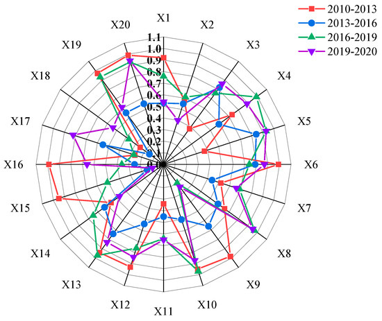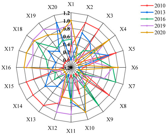 The standardized values of each indicator from 2010 to 2020 are shown in Figure 4.