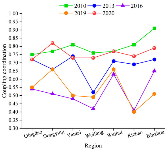 The trends in the changes in the CD of the four subsystems in each city exhibit significant differences. Regarding environmental pressure, Qingdao, Yantai, and Weihai showed a pattern of decreasing CD in environmental pressure followed by an increase, with peak and trough values observed in 2010 and 2016. In contrast, the CD of environmental pressure in Rizhao showed an opposite trend, while the CD in Weifang and Binzhou fluctuated within a certain range. In terms of population pressure, Dongying, Yantai, and Weifang exhibited a trend of decreasing CD in population pressure followed by an increase, with peak and trough values observed in 2010 and 2019. Conversely, Weihai demonstrated the opposite trend, and the population pressure CD in Qingdao, Rizhao, and Binzhou fluctuated. For coastal resources, Dongying, Yantai, Weifang, and Binzhou showed a trend of initially increasing and then decreasing CD in coastal resources. The changes in the CD of coastal resources in Qingdao and Rizhao were relatively complex. In the aspect of economic development and social support, except for Weihai showing a trend of initially increasing and then decreasing CD, the trends in other cities exhibited fluctuations, with the CD in 2020 being greater than in 2010.