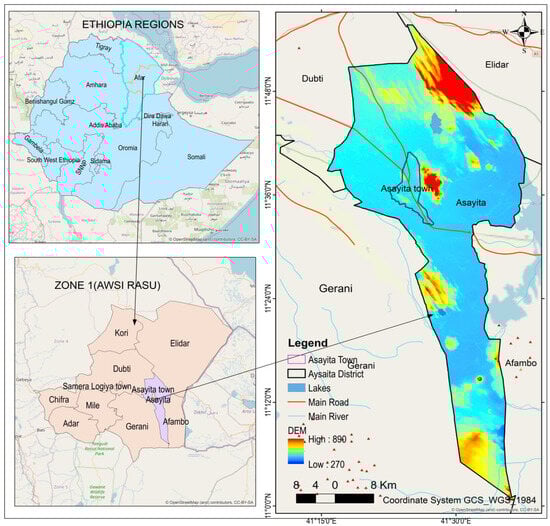 The investigation was carried out in the Aysaita district, located in the Afar Regional State of Northeastern Ethiopia. Aysaita serves as the administrative city of the Aysaita district and Awsa zone, having previously been the capital of the Afar Regional State of Ethiopia before 2007 (Figure 1). Aysaita is situated 655 km to the northeast of Addis Ababa, the capital city of Ethiopia, and 65 km from the capital of the Afar region, Samara. The elevation of the area is approximately 300 meters above sea level. The Aysaita district comprises 13 kebeles, of which two are classified as urban and the remaining 11 as rural. The total number of households in the district is 9740 []. The predominant agricultural activities are pastoral and agro-pastoral farming systems. In total, 53% of rural households were engaged exclusively in livestock rearing (pastoralists), while the remaining 47% were engaged in both livestock and crop production (agro-pastoralists) [].