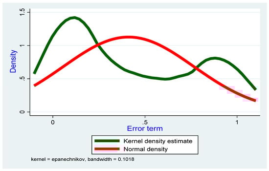Furthermore, the Variance Inflation Factor (VIF) was employed to ascertain the presence of significant multicollinearity between all the independent variables incorporated into the model. The VIF values for all independent variables included in the model were less than 5 (1.03–2.63), indicating that no serious multicollinearity was present. Accordingly, all 13 hypothesized independent variables were incorporated into the model. Finally, the error term of the probit model was also subjected to a test for normality. The kernel density graph for the error term of the probit model demonstrated that the estimated line was not significantly closer to the normal distribution line, indicating that the error term was not normally distributed (Figure 3). The results were also corroborated by the Shapiro–Wilk test, which rejected the null hypothesis of normal distribution (Z = 7.766, Prob > Z = 0.000), indicating that the error term is not normally distributed. Consequently, the robust estimator was employed to mitigate the potential bias from non-normality and outliers.