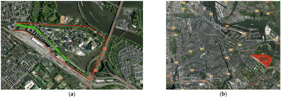 (a) Map of Science Park boundary (red) and Carolina Macgillavrylaan (green); (b) Map of Science Park within the surrounding city of Amsterdam.