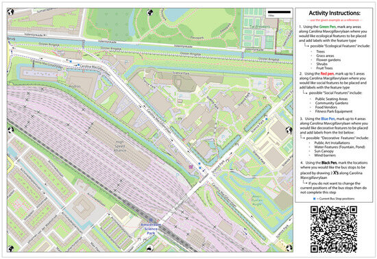 The final participatory mapping experiment comprised two parts. Firstly, the participants were instructed to indicate their desired locations for ecological, social, and decorative elements along the street. Within each of these three categories, the participants were presented with specific sub-elements that they could pick and choose from. For instance, “ecological” elements encompassed trees, shrubs, and grassy areas, while “social” elements included seating areas, food vendors, and community gardens. The third category, “decorative” features, included public art installations, wind barriers, and water features. Importantly, these sub-elements were not arbitrarily selected but were reflective of the suggestions voiced during initial stakeholder discussions, underscoring their relevance to the community’s values and representation. A mix of notative and indicative instructions were given to incite sketches, with phrasing such as “mark 3–5 areas along…” and “draw an X where…”. Additionally, the participants were instructed to label each feature with a specific type from the given list. This gave the participants enough freedom to illustrate their wishes while also directing them to a defined area and type. In response to the observed confusion during the trial attempts and to guide the mapping process efficiently, example maps were made available if the participants needed further clarification. The example maps were specifically made to depict a different street to avoid potential bias or influence. Figure 4 below reveals the exact layout of the mapping activity with instructions.