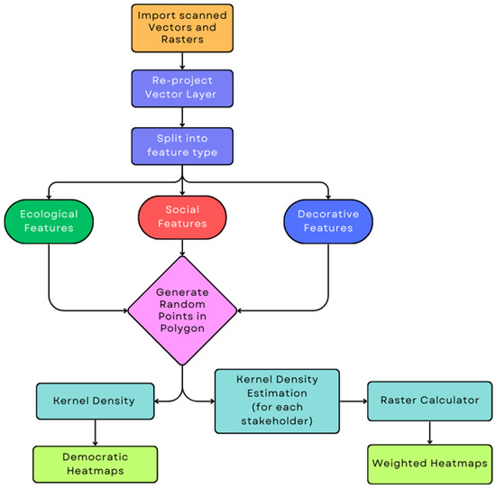 Following the digitization of the data, all the polygons were given an attribute number in order to create separate layers based on their respective feature class; ecological, social, and decorative. A second attribute class was added to distinguish the polygons based on their stakeholder status. At this point, the methods split slightly for the democratic and weighted outcomes. For the democratic result, random points were generated within all the polygons at a density of 1.000. Using these points, kernel density estimation was conducted at a 50 m radius and a 1 × 1 pixel resolution. This generated the final heatmaps. For the weighted results, random points were generated separately for each stakeholder group within each feature class. This created a total of 4 different layers per feature type—a total of 12 layers. Kernel density maps were generated for each layer individually using the same radius and resolution. Then, using the raster calculator, the raster density layers for each stakeholder class were multiplied by their correlating weight and combined. By generating each layer individually first, each stakeholder group was standardized to the same level, allowing for proper weighting to occur. A brief visual summary of the GIS steps can be seen below in Figure 5.