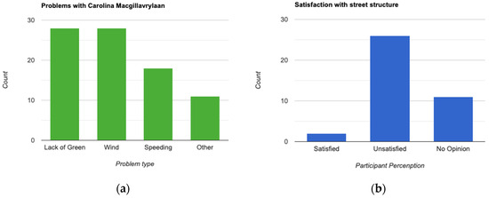 Bar graphs of descriptive statistics; (a) problems with Carolina Macgillavrylaan; (b) stakeholder satisfaction with current street structure.