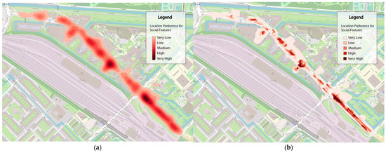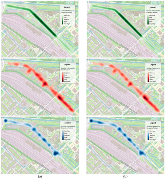 Figure 8 reveals the preferred locations for each feature type as generated by the democratic and weighted method. All the heatmaps were illustrated using discrete classes to accentuate the differences.