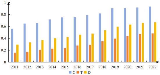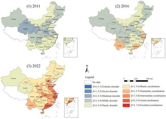 Based on the CCD calculation results, we analyzed the spatial evolution characteristics and selected three representative years, 2011, 2016, and 2022, for ArcGIS 10.8 visualization (Figure 4). Its characteristics are as follows:
