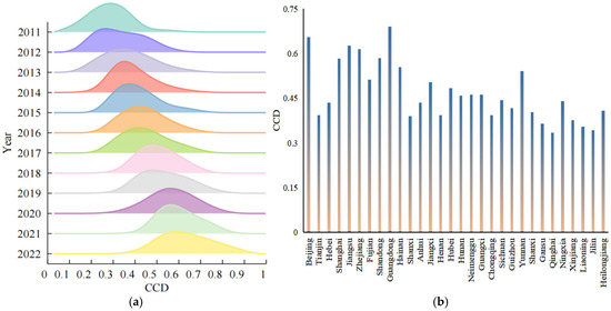 CCD distribution in each year and CCD mean value in each province. (a) CCD distribution in each year. (b) CCD mean value in each province.