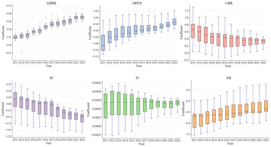 The GTWR model was used to calculate the annual average regression coefficients of the different influencing factor variables for each year during the study period, and a box plot was drawn based on the changes in the coefficients (Figure 5). The coefficients of the two variables of economic development (GDPR) and urbanization rate (UBR) were positive, and the regression coefficient mean of UBR was the largest, indicating that UBR is the most critical factor affecting CCD. Foreign investment (OPEN) and environmental regulation (ER) negatively impacted the CCD but weakened annually in the later stages, reducing the degree of dispersion. Although the regression coefficients of technological innovation (TI) in each year were positive, the values were small. The impact of industrial structure (IS) on CCD turned from positive to negative, and the negative impact increased annually.