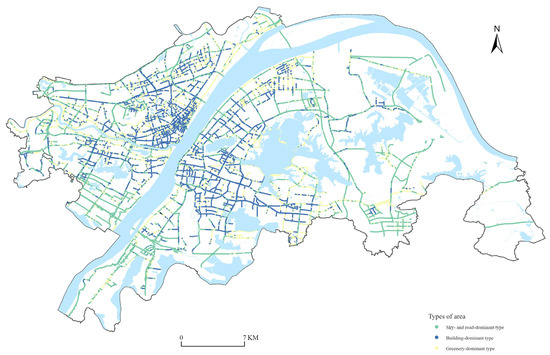 To further analyze the heterogeneous impact of different built environment features on street-level safety perceptions across various regions of Wuhan, this study employed the K-means clustering module via SPSS 25.0 software. This method effectively delineates areas based on their influence on women’s safety perceptions. As a whole, clusters with significant characteristics indicate strong spatial aggregation, and the research area was ultimately classified into three types of regions: Sky- and road-dominant type (Type 1), Building-dominant type (Type 2), and Greenery-dominant type (Type 3) (Table 6 and Figure 11). Type 1 is the main visual domain aggregated in the suburban or industrial area, which tends to be observed along major roads, reflecting a driving visual experience with poor vegetation. The city center area is predominantly classified as Type 2, indicating that earlier built communities contribute to a more inclusive and complex artificial environment. Additionally, safety scores in this area show greater variability. While areas along East Lake, the Han River, and parts of the outer ring are characterized by Type 3, this is likely due not only to their relatively low development density but also to the presence of vegetation that has overgrown these areas. And this area is typically associated with low safety scores.
