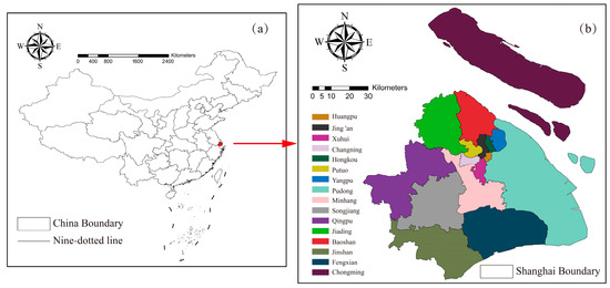 Study area. (a) Shanghai’s location in China; (b) Distribution of Shanghai’s 16 districts.