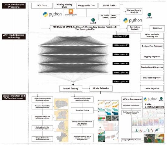 To support sustainable development and efficient urban planning of CMPBs, our research introduces a machine learning-based prediction and analysis method. This study aims to achieve the following five objectives: Firstly, to conduct a correlation analysis of CMPBs in Shanghai using extensive POI data and representative VVVs data, enhancing the scientific accuracy of site selection decisions for future projects through data-driven insights. Secondly, to train and validate an ANN model through multi-scenario simulations and testing with untrained data, ensuring its reliability across various scales and scenarios. Thirdly, to propose an innovative model combining an ANN and a GA to predict the siting and vitality improvement of CMPBs, offering both theoretical value and practical utility for professionals. Fourthly, to develop an infrastructure optimization scheme for the Songjiang District Museum in Shanghai using this new method, demonstrating its effectiveness in enhancing the vitality and operational efficiency of CMPBs, and providing specific improvement suggestions based on actual conditions. Finally, to provide research results that inform government and institutional planning and policy for CMPBs, promoting rational and efficient resource allocation and offering researchers a novel approach.