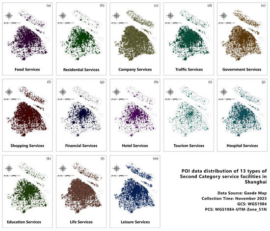 Points Of Interest (POI) data were collected from the AutoNavi Open Platform3 by calling the AutoNavi Map API in November 2023. After preprocessing, irrelevant POI data, such as place name and address information, were removed. Ultimately, we used 986,474 POI data points. AutoNavi Map classifies POI data into 23 main categories and 265 secondary categories, including catering services, scenic spots, public facilities, shopping services, and scientific education and cultural services4. Our study is based on this classification system and references related studies [29,30]. We adjusted the classification to meet the research needs, focusing on three categories of first-level service facilities and 13 categories of second-level service facilities (Table 2 and Figure 3).