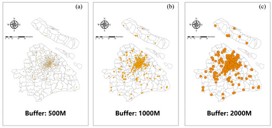 We used the previous data set along with the ArcGIS fishing net tool to select four administrative districts in Shanghai. Based on the distance division criteria of the buffer zone for this study, we set the grid size for each administrative district to 1000 M by 1000 M, which corresponds to the pixel width and height in the fishing net tool. Additionally, we selected the “Create Annotation Points” option and chose “POLYGON” as the geometry type. After running the tool, we cropped the newly generated mesh to define the final study area grid. Next, we calculated the center points of each grid. To determine the latitude and longitude of these center points, we added fields, set the field type to floating point, used the “Calculate Geometry” function, and selected the X- and Y-coordinates of the center points based on latitude and longitude. We displayed the coordinates in the decimal system. After completing these steps, we obtained the central points with their corresponding latitude and longitude. Finally, we created three buffer zones (500 M, 1000 M, and 2000 M) based on the coordinate points of each grid center and calculated the number of POI data for 13 types of second-category service facilities within each buffer zone.