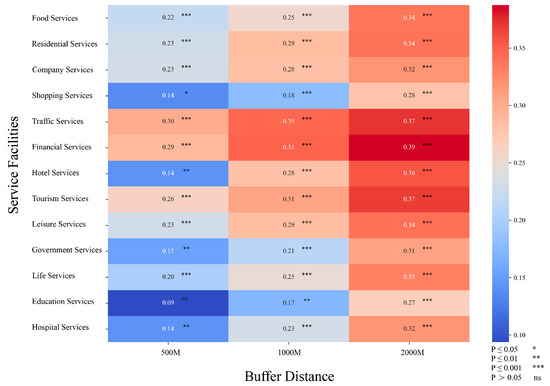 The analysis results (Figure 6) show that, among the 39 data sets of 13 types of secondary facilities and VVVs at three buffer zone levels in Shanghai, the p-values for 38 data sets are less than 0.05. Only one data set has a p-value greater than 0.05, indicating that the correlation analysis for 97.4% of the data sets is statistically significant. The average values of the three-level buffer are all positive values, being 0.20, 0.26, and 0.33, respectively. The numerical value of reflects the strength of the relationship between the two variables. According to the numerical results, there is a moderate correlation between the 13 types of secondary facilities and VVVs, and as the distance increases, the correlation between the two gradually increases (Figure 7).