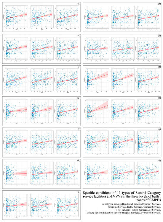 Specific conditions of 13 types of Second Category service facilities and VVVs in the three levels of buffer zones of CMPBs. (a–m) Food services, Residential Services, Company Services, Shopping Services, Traffic Services, Financial Services, Hotel Services, Tourism Services, Life Services, Leisure Services, Education Services, Hospital Services, Government Services.