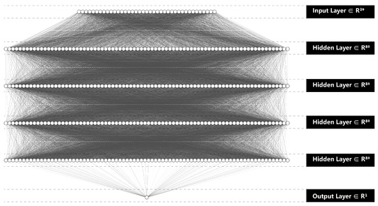 TensorFlow, an open-source machine learning framework, is utilized extensively for constructing and training neural network models tailored for diverse data classification tasks [33,34]. In this study, TensorFlow is employed to develop an Artificial Neural Network (ANN) model comprising three main layers: an input layer with 39 neurons representing the service facility data for each Cultural and Museum Public Building (CMPB), four hidden layers with 80 neurons each (Figure 8), and an output layer consisting of one neuron representing the visitor vitality data for each CMPB. Generally, increasing the number of hidden layers and neurons within these layers has the potential to enhance prediction accuracy. While increasing the number of hidden layers and neurons can improve prediction accuracy, it also prolongs the training time and raises the risk of overfitting [35]. To address these challenges, we disabled TensorFlow’s Eager Execution mode in order to use the graph-based traditional execution mode, which may be easier to control and optimize in some complex neural network-training scenarios. For optimizer configuration, an AdamOptimizer optimizer was created with a learning rate of 0.001, and it was associated with the loss function cost using the minimize method to minimize the loss function during training.