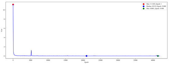 At the same time, to better verify the results of the output layer during the training of the ANN model, feedback on the deviation between the predicted output and the actual data output is provided. The mean square error (MSE) function is selected in the setting of the loss function to evaluate the performance of the neural network, and back propagation is allowed to update the neural network parameters and (Equation (4)). Thus, this study conducted an initial assessment of the ANN using the architecture described above, utilizing 300 training data sets to evaluate its training efficacy. The experiment comprised 42,000 training cycles, during which the model achieved its lowest error value of 0.0081 at the 41,400th cycle. Generally, a smaller value of the loss function indicates superior performance of the trained model (Figure 9).