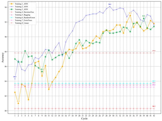 Additionally, to enhance the robustness of our findings, we trained five additional deep learning models using the same data set. These models share a consistent operating logic and ANN structure, with a custom loss function designed to evaluate prediction accuracy. The custom loss function takes two parameters—ground truth and predictions—and computes the absolute error between them. This error is multiplied by 100, and the median of the resulting values is calculated (np. median). Finally, the result is rounded to one decimal place to provide a clear measure of accuracy. This function effectively quantifies the deviation between predicted and actual values, offering a standardized metric for evaluation. The median accuracy results obtained are as follows: DecisionTree Regressor 80.3%, Bagging Regressor 83.5%, RandomForest Regressor 83.7%, ExtraTrees Regressor 83.2%, and Linear Regressor 87.8%. Despite these competitive accuracies, the ANN model, particularly “Training 2”, surpasses these performances with 88.3% accuracy by the 18th cycle and peaks at 92.9% by the 36th cycle. This underscores the robust performance advantage of the ANN model in addressing the specific challenges of this research topic (Figure 10).