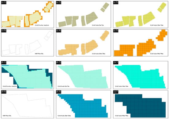 Comparison of scene grid scales. (a) The grid scale of the Shanghai Industrial Museum; (b) The grid scale of the Shanghai Museum North Building; (0–5) are SHP Plot File, Grid Overlay Analysis, Grid Scale: 5 m × 5 m, 10 m × 10 m, 20 m × 20 m, 50 m × 50 m.