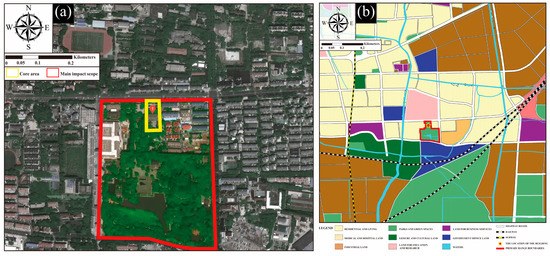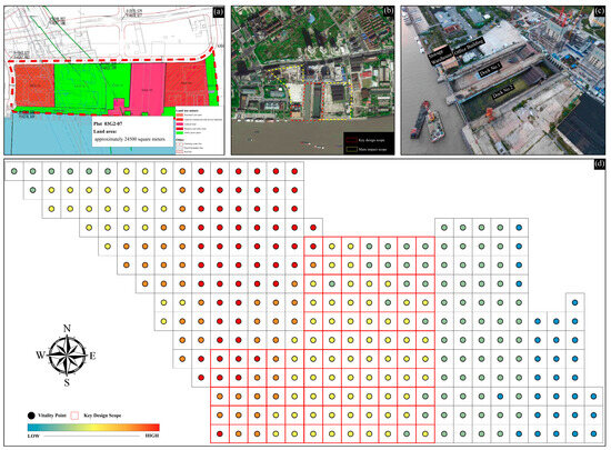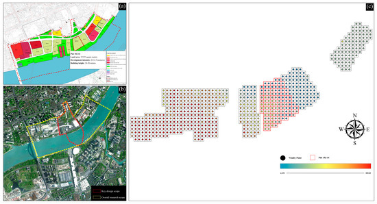 Shanghai Industrial Museum site situation and VVVs prediction results. (a–c) are site planning situation, research and design scope map, and design scope vitality value prediction. (a,b) the pictures provided by Shanghai Urban Planning and Design Institute were redrawn.