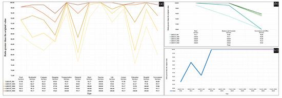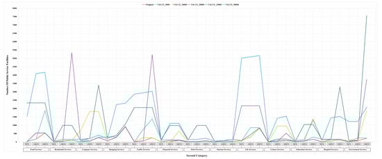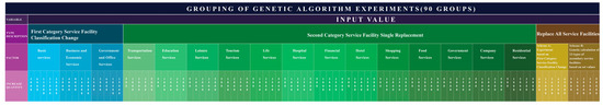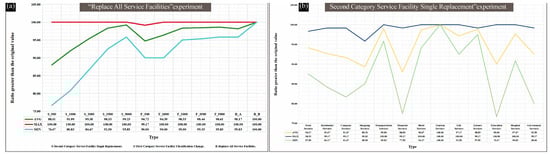 As shown in Figure 22, in the “Second Category Service Facility Single Replacement” experiment, only the “GROUP_500” for Education Services failed to surpass the original VVVs. Among the experimental groups that varied by the number of facilities, Financial Services showed the least improvement. This is due to the more indirect role Financial Services play in the sustainable development of CMPBs.