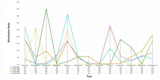 Figure 23 and Figure 24 reveal that the allocation weights for various types of service facilities fluctuate across different experimental groups. For instance, in the “VALUE_5000” group, Traffic Services have the highest allocation weight, while in the “VALUE_10000” group, Company Services take the lead. However, Company Services have a lower allocation weight in the other four groups. Although Traffic Services does not always receive the highest allocation, it consistently receives a substantial portion. Special cases, such as “VALUE_10000”, indicate that the algorithm strategically adjusts weights, favoring specific service types to maximize visitor vitality. This idealized operation may not directly translate into real-world guidance, as the synergistic benefits of Company Services and CMPBs may not be as pronounced in practice. Implementing such an allocation in reality could lead to unbalanced urban development and inefficient service provision.