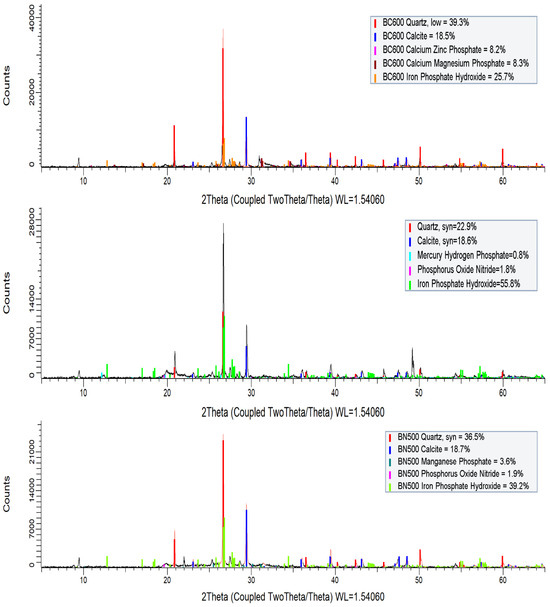 The pyrolysis environment had a significant effect on H2O-, NaHCO3-Pt, NaOH-Pi, NaOH-Pt, HCl-P, and residual P. The current results indicated that biochar produced under the CO2 environment contained more H2O-Pi (average 367 mg kg−1) than under the N2 environment (average 185 mg kg−1). Similarly, biochar produced under the CO2 environment contained more total P (34,408 mg kg−1), NaHCO3-Pt (2428 mg kg−1), NaOH-Pt (5501 mg kg−1), and residual P (8175 mg kg−1) than that prepared in the N2 environment, the value representing total P (30,383 mg kg−1), NaHCO3-Pt (2306 mg kg−1), NaOH (4555 mg kg−1), and residual P (9127 mg kg−1). However, the stable fraction of P (HCl-P) was slightly higher under N2 (11,427 mg kg−1) than under CO2 (11,169 mg kg−1). Zhang et al. [26] also reported similar results, where the total P recovery rates were higher under CO2 than higher than N2. Tan and Yuan [27] also reported similar results, where the relative content of inorganic P was higher in the atmosphere of CO2 than in the N2 atmosphere. The reason could be that the adsorption mechanism of phosphate ions in sewage sludge biochar includes the hydrolysis of minerals at their first stage, such as calcite or dolomite, which subsequently increases the interaction between Ca2+ and PO43−/HPO42−/H2PO4− ions, leading to the formation of crystal or precipitates. For instance, X-ray diffraction (XRD) results in Figure 1 revealed that the percentage of calcite decreased more under CO2 than under N2 with increasing pyrolysis temperature [28].