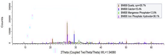 The XRD spectra showed the crystalline mineral phases present in both biosolids and their derived biochar samples (Figure 2). From the XRD pattern, the main crystalline phase was quartz after pyrolysis [26]. The presence of calcite, magnesium calcite, and iron phosphate hydroxide indicated that the Ca, Mg, Fe, and P were the main inorganic components in biochar [9]. Initially, the signal intensity for different biochar samples was varied; for example, the intensity for quartz was initially low (21.7%, Figure 2) in biosolids, which was gradually increased at 600 °C, and the value was 39.9% under a CO2 environment and 35.7% under a N2 environment. With increasing pyrolysis temperature, the peak intensity for calcite was reduced due to the decomposition of calcite into CaO [30]. The change in the XRD pattern for P was different under different pyrolysis temperatures, which also proved the migration of P under different pools (i.e., NaOH-P to HCl-P) [14].