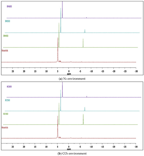 The total P recovery under the NaOH-EDTA solution was slightly higher under CO2 than under N2. Moreover, biochars produced under N2 had pH values ranging from 7.47 to 11.26 at temperatures from 400 °C to 600 °C, respectively. When produced under CO2, the pH ranged from 6.53 to 8.08, as it could be seen in our previous work [24]. Xu et al. [11] reported that the pH of biochar significantly affected the P extractability, as P is tightly bound under alkaline conditions. Therefore, the extraction recovery rates were lower than in the acidic conditions. Three signals can be identified for the P compound, which was mainly orthophosphate, pyrophosphate, and orthophosphate monoesters in liquid NMR spectra in Figure 2. Orthophosphate(5–7 ppm) and pyrophosphate (−4 to −5 ppm) are the two most dominant species of P species identified in biochars [15] and major constituents of P pools. However, there was an additional signal identified for biosolids, which are represented by organic P (i.e., orthophosphate monoesters) [15], which disappeared in biochar produced under different temperatures and carrier gases, which is similar to previous studies [3]. The peak corresponding to organic P disappeared, while inorganic P (Ortho and Pyro-P) remained with increasing pyrolysis temperatures (Figure 2), indicating that the organic P migrated into ortho-P and pyro-P during pyrolysis [11].