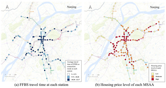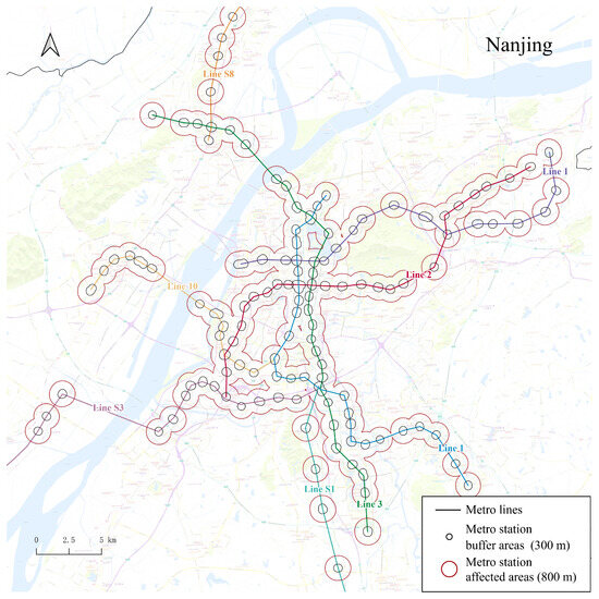 This study analyzes accessibility using data from nine selected metro lines and 142 stations in Nanjing. Building on previous studies [52], metro passengers typically search for feeder buses within a 300 m transfer distance. Therefore, this study uses Metro Station Buffer Zones (300 m) around metro stations to examine modal integration with bike-sharing. Based on previous studies [53], the spatial range of a transit-oriented development area is typically defined by the walking distance from home to the transit station, usually ranging from 400 to 800 m for most transferring travelers. Accordingly, Metro Station Affected Areas (800 m) around metro stations are used to calculate the average housing prices in the surrounding neighborhoods. Housing prices are used as an indicator of the economic context, which will be discussed in detail in Section 3.2.1.