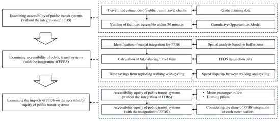 The methodological framework, shown in Figure 2, comprises three components. First, we evaluate the facility accessibility of public transit systems without FFBS integration. Second, we assess the facility accessibility of public transit systems with FFBS integration and measure the improvements in accessibility enabled by FFBS. Third, we analyze the accessibility equity of public transit systems with and without FFBS integration and examine the effect of FFBS on accessibility equity.