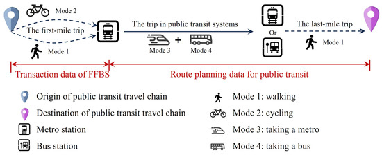 This study uses transaction data from FFBS and route planning data for public transit to estimate the total travel time of the public transit travel chain, as shown in Figure 3. The public transit travel chain includes two stages: (1) the first stage covers the first-mile trip from the origin to the metro station; (2) the second stage involves the journey within the public transit system and the last-mile trip. Mode 1 assumes walking is used for first-mile connections, whereas Mode 2 assumes FFBS is used for the same. This study considers both cycling and walking as potential first-mile travel modes.
