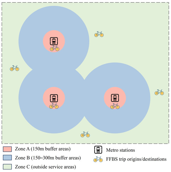 To evaluate these criteria, the study starts with a buffer analysis (see Figure 4) to identify two primary scenarios for FFBS trips: (1) Scenario 1 includes trips starting in Zone A and ending in either Zone A or Zone B, or starting in Zone B and ending in Zone A. These trips typically integrate with public transit to reduce metro transfers. (2) Scenario 2 involves trips between Zone A and Zone C, emphasizing the potential for modal integration with public transit. Additional scenarios consider FFBS as Modal Substitution (MS) or Modal Complementation (MC). In the second step, trip durations are analyzed, classifying trips under 30 min as MI trips and trips exceeding 30 min as recreational. These MI trips connect metro-underserved areas to the nearest stations. The number of daily MI trips and the average travel time for each metro station are then calculated.
