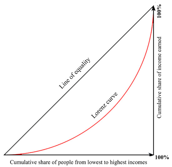 Figure 5 depicts a typical Lorenz curve. The horizontal axis represents the cumulative share of individuals, ranked from lowest to highest income, while the vertical axis shows the cumulative share of total income. The straight line in this diagram represents the line of equity, reflecting an ideal distribution in which, for instance, 50% of the population holds 50% of the total income. The Lorenz curve, typically lying below the equity line, represents the actual income distribution. The Gini coefficient, derived from the Lorenz curve, quantifies inequality by comparing the area between the equity line and the Lorenz curve to the total area under the equity line. It ranges from 0 to 1, where a higher Gini coefficient indicates greater inequality (with a Lorenz curve farther from the equity line), and a lower coefficient signifies a more equitable distribution (with a curve closer to the equity line). The Gini coefficient is calculated as follows: