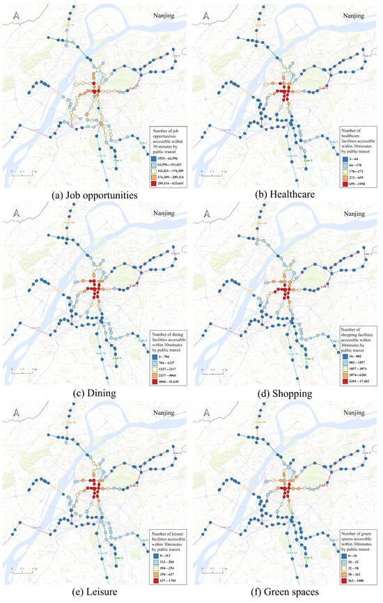 The cumulative opportunity model provides a robust framework for calculating metro accessibility across various travel destinations, evaluating how different areas of a city are served by public transit. The spatial distribution of accessibility within a 30-min travel time, shown in Figure 6, reveals a clear pattern: central urban areas, particularly around Xinjiekou, exhibit significantly higher accessibility than the outskirts. This pattern is common in metropolitan transportation systems, where central business districts and major transit hubs typically benefit from superior connectivity due to the concentration of key amenities and high-density development.