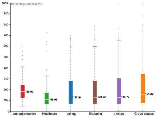 The results show that the improvement in accessibility varies across different destination types. Job opportunities benefit the most, with accessibility increasing by a remarkable 180.02%. This is likely because employment centers are concentrated in central areas, and enhanced first-mile connectivity improves access, allowing workers to reach job sites more quickly and affordably.
