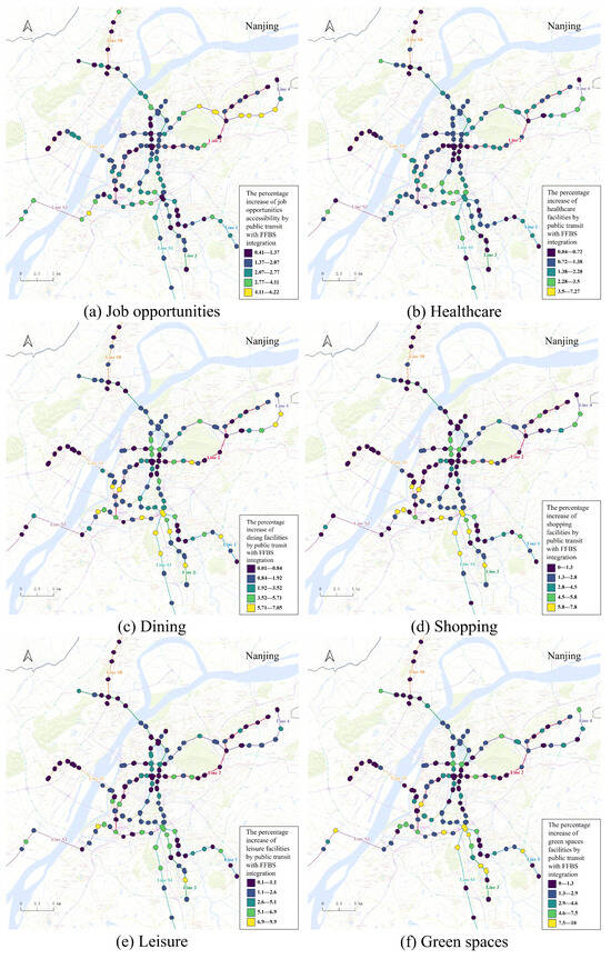 The results show that replacing walking with FFBS for first-mile segments significantly improves travel efficiency. This improvement in efficiency leads to significant increases in the accessibility of public transit systems to six types of destinations: job opportunities (180.02%), green spaces (155.82%), shopping (129.02%), leisure (128.77%), dining (123.94%), and healthcare (108.09%). The distribution of these improvements shows spatial heterogeneity, with more pronounced gains and higher station concentrations observed in the central urban area and peripheral residential clusters. This suggests that facilities primarily accessed by public transit can benefit from targeted improvements to the cycling infrastructure. Consequently, this improvement boosts the competitiveness of the FFBS–metro integration strategy, significantly enhancing public transit’s contribution to sustainable urban development.
