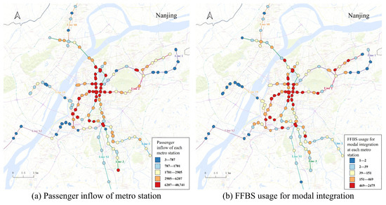 To investigate the extent of bike-sharing use in modal integration with public transit, we collected transaction data from both the metro and FFBS systems. The metro transaction data include details of passenger entries and exits at each station. By processing and analyzing these data, passenger inflow and outflow at each station can be quantified. The FFBS transaction data include information on bike rentals and returns. Spatiotemporal matching allows for the identification of FFBS trips that connect to metro stations. All transaction data were collected on 7 July 2020 (Tuesday), 8 July 2020 (Wednesday), and 9 July 2020 (Thursday), with the corresponding data fields shown in Table 2 and Table 3.