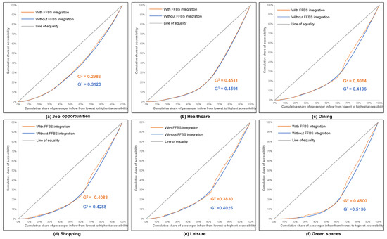 The equity assessment results show that, without FFBS integration, the Gini coefficients for accessibility across various travel destinations are ranked from highest to lowest as follows: green spaces (), healthcare (), shopping (), dining (), leisure (), and job opportunities (). These rankings indicate an inequitable distribution of facility accessibility within the current public transit system. In contrast, FFBS integration improves accessibility equity, with the enhanced Gini coefficients ranked from highest to lowest as follows: green spaces (), healthcare (), shopping (), dining (), leisure (), and job opportunities (). The improvements in accessibility equity, ranked from greatest to least, are as follows: green spaces (), shopping (), leisure (), dining (), job opportunities (), and healthcare (). These findings suggest that FFBS integration significantly improves the accessibility equity of public transit systems across different opportunities.