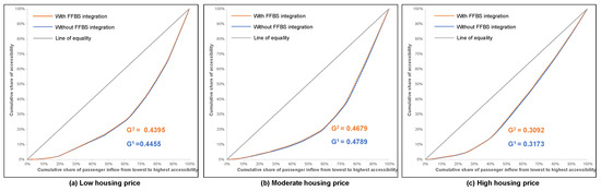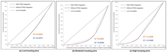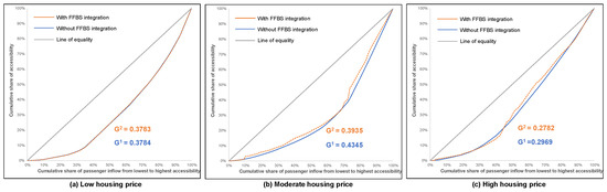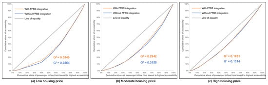 When we examine the impact of FFBS integration on accessibility equity, a clearer picture emerges. Specifically, we observe that the Lorenz curves for MSAAs with high and moderate housing prices shift closer to the equity line after the integration of FFBS, with G-values improving from to and from to . This shift indicates a significant enhancement in the accessibility equity of metro systems when FFBS is integrated into the transportation network. The inclusion of FFBS facilitates better first-mile and last-mile connectivity, improving access for underserved areas, which in turn leads to a more equitable distribution of public transit services across the urban population.