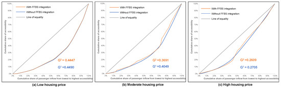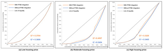 However, in MSAAs with low housing prices, the integration of FFBS appears to have an opposite effect on accessibility equity. Specifically, the Gini coefficients for low-priced MSAAs are as follows: without FFBS integration and with FFBS integration. The curve with FFBS integration is farther from the equity line, indicating that FFBS integration does not improve accessibility equity in these areas. This contrast may be due to green spaces typically being located in suburban areas with low housing prices, similar to leisure facilities.