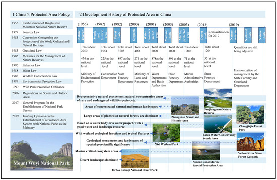 China is also facing the challenge of improving the quality of its protected areas [25]. Its conservation efficiency is primarily affected by problems such as overlapping and unclear boundaries and multiple management entities [26,27,28,29]. Therefore, China is reforming its protected areas. Since establishing the first nature reserve in 1956, developing protected areas in China has undergone tremendous changes, and evolved from single to multiple types, small to large areas, and individual protection to construct regional ecological security barriers, forming a complex system of protected areas [27,30,31,32]. By the end of 2021, China had established approximately 11,800 protected areas of various types [33,34]. This accounted for 18% of the land area and reached a conservation target of 17% of the 2020 Aichi targets ahead of schedule [35]. As one of the richest countries in the world in terms of species diversity, protected areas are at the forefront issues of maintaining national ecological security. At present, China’s protected areas effectively protect 90 per cent of terrestrial ecosystem types, 85 per cent of wildlife populations, 65 per cent of higher plant communities and nearly 30 per cent of important geological relics, and cover 25 per cent of pristine natural forests, 50.3 per cent of natural wetlands and 30 per cent of typical desert areas [36,37,38]. However, the problem of overlapping protected areas in China is also very serious, with the service overlap rate of buffer zones within 5 km of protected areas at the national level alone being 16.31 per cent, within 10 km 25.03 per cent, and within 20 km even as high as 42.08 per cent [37,39,40,41,42]. Thus, although China’s protected areas have met the Aichi targets, the level of protection falls short of “eco-representativeness”. In particular, reptiles, amphibians and plants, which have low coverage in existing protected areas, require more stringent protection [37,43]. China’s State Council issued the Guiding Opinions on the Establishment of a Protected Areas System with National Parks as the Mainstay stay to promote the high-quality development of protected areas in 2019 [44]. This was undertaken to solve the overlap problem through reintegration and reclassification of the types of protected areas. Protected areas were consolidated from more than ten types (e.g., nature reserves, scenic and historic areas, forest parks, wetland parks, mine parks, and marine parks) into national parks, nature reserves, and nature parks [44]. They were incorporated into the State Forestry and Grassland Administration for unified management (Figure 1). In this integration and categorization process, one particular type of protected area, scenic and historic areas do not require changing their original location and scope.