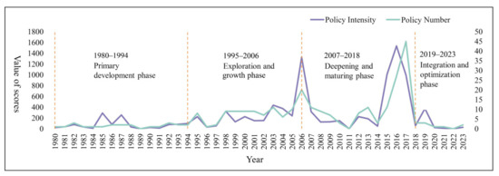 We analyzed the annual changes in policy intensity and quantity (Figure 4). From 1980 to 1994, the number of policy documents was small, overall policy intensity was low, the degree of national awareness regarding the protection of scenic and historic areas was low, and the development of the scenic and historic area system was in the primary phase. From 1995 to 2006, the number and intensity of policies increased. During this period, China had a broader discussion on the content involved in constructing scenic and historical areas. From 2007 to 2018, policy intensity sharply increased, the number and intensity of policies grew, and the development of scenic and historic systems maturing. After 2019, the development of scenic and historic areas entered a new phase, and the number and intensity of policies showed a short-lived abatement trend during the last five years. The number and intensity of policies essentially maintained the same development trend. However, the number of policies decreased while intensity increased in certain years.