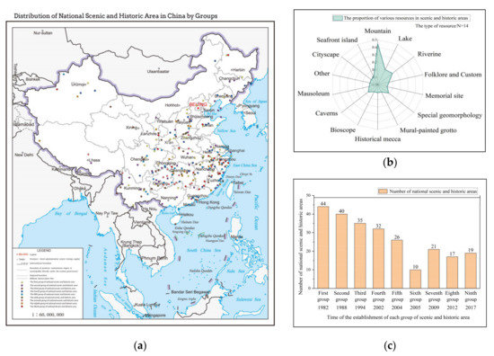 In 1981, the State Council issued Notifications on the Report on Strengthening the Management of Scenic and Historic Areas Protection, indicating that it attached importance to the management of scenic and historic areas. In 2006, the State Council issued the Regulations on Scenic and Historic Areas. Since then, scenic and historic areas had a formal regulatory basis. In 2019, the State Council issued Guiding Opinions on the Establishment of a Protected Areas System with National Parks as the Mainstay. China’s protected areas system was reintegrated, and scenic and historic areas began developing. In addition, we analyzed the distribution of the number, resource distribution and their establishment year of national scenic and historic areas (Figure 5a–c). Nine groups of scenic and historic areas were approved and established by the Chinese state. The first, third, sixth, and ninth groups of scenic and historic areas were established in 1982, 1994, 2005, and 2017, respectively.