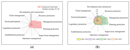 The topics of each policy code were extracted and summarized into ten categories: development and construction, resource protection, management protection, planning protection, supervision management, operation management, establishment protection, legislation protection, social participation, and ticket management (Figure 6a). Planning protection (30.52%) and management protection (28.65%) were high, followed by resource protection (11.28%), development and construction (7.95%), supervisory management (6.41%), social participation (2.19%), and operation management (0.81%). Planning and management protection were considered to be key topics, whereas social participation and operation management were neglected.