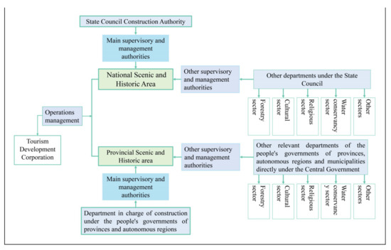 In this phase, China began to integrate and optimize its protected areas and establish a protected areas system with national parks as the mainstay [44]. Some remained problems of establishing scenic and historic areas, such as the lack of a fixed time for declaration, demonstration, and review as well as multiple management and cross-management remain to be addressed [51,112]. Scenic and historic areas fall under the jurisdiction of the construction sector. However, due to their resource attributes, they overlap with other protected areas. Departments of cultural heritage, forestry, and environmental protection also have management authority (Figure 7). These situations seriously affected the efficiency of scenic resource protection and management.