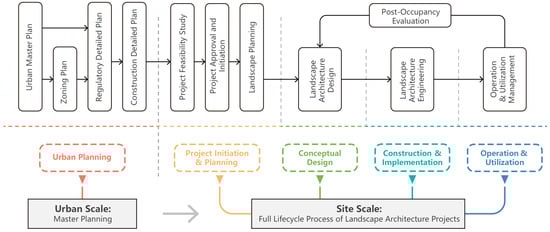 The planning, design, and construction process of landscape architecture projects can be divided into two major stages based on scale hierarchy: urban scale and site scale. In this context, site-scale landscape architecture projects necessitate an expansion based on higher-level plans proposed at the urban scale. These plans include urban master plan, zoning plan, regulatory detailed plan, and construction detailed plan. Simultaneously, site-scale landscape architecture projects can be categorized according to the entire lifecycle process into four stages, namely, Project Initiation and Planning, Conceptual Design, Construction and Implementation, and Operation and Utilization, thus forming the entire lifecycle process of landscape architecture projects (Figure 1).