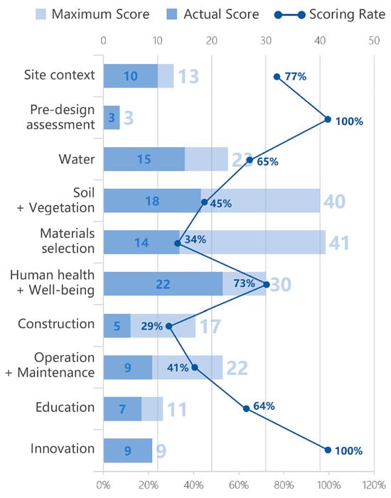 Xuhui Runway Park received a total score of 112 points in the SITES certification, earning it a Gold-level certification. It received full scores in “Pre-design Assessment + Planning” and “Innovation Or Exemplary Performance”. The park performed well in the “Site Context”, “Site Design—Water”, “Site Design—Human Health + Well-Being”, and “Education + Performance Monitoring” sections, with scores above 50%. However, it scored relatively lower in the “Site Design—Materials Selection” and “Construction” sections (Table 1, Figure 4) [].