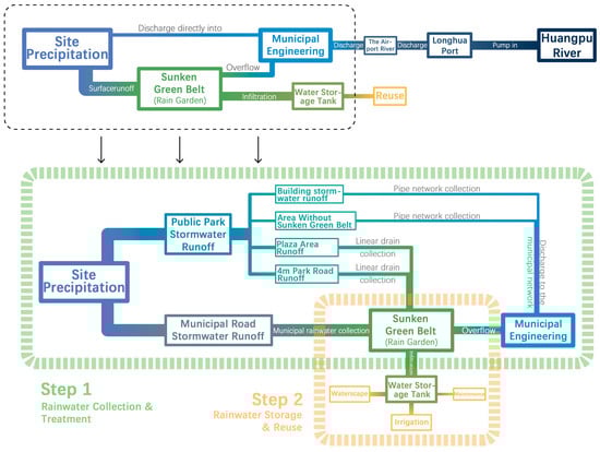 During the design stage, Sasaki’s design team systematically planned the whole process of collecting, purifying, storing, discharging, and utilizing rainwater in Xuhui Runway Park (Figure 6). The rainwater treatment process can be divided into two stages: the first stage is collecting and treating rainwater; the second stage is storing and utilizing rainwater. The precipitation within the site is collected in the rainwater collection and treatment stage. Water quality is purified through various forms of aesthetic rainwater management facilities, such as rain gardens, artificial wetlands, and linear drainage facilities. In this stage, the cistern at the bottom of the rain garden provides storage space for the purified rainwater. The collected rainwater can meet the irrigation needs of all vegetation and water supply for the water features in the park. Therefore, the park no longer needs additional water resources.