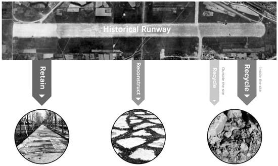 The “ecological recreational green space and public open space change model”, which focuses on developing a high-quality modern service industry, is a crucial way to renew the industrial heritage along Shanghai’s Huangpu River []. Xuhui Runway Park reflects the historical heritage of the site in the following aspects: the expression of the concept, the use of materials, the continuation of scale, the borrowing of shape, the imitation of terrain, and other design details. The image and significance of the site as the only aviation industrial heritage are reinforced. These design techniques rejuvenated this industrial heritage site that had lost its vitality. The sustainable development of the site also serves as a continuation of the city’s historical heritage [].